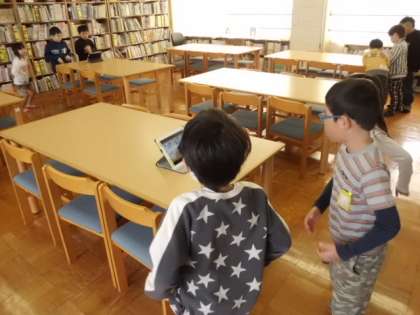 1年生の子どもたちがタブレットPCをみながら踊っています。