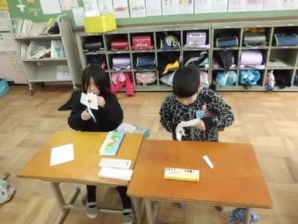 小さな紙に楽しそうな絵を描いて切り取っています。
