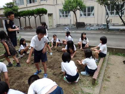 みんなで協力して,土を耕し,雑草を抜いて種まきの準備をします。