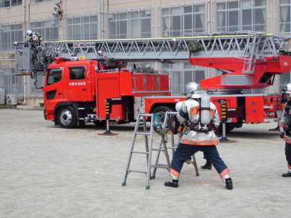 消防車やはしご車もきて,緊張感ある訓練ができました。