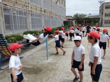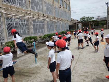 梅雨の晴れ間に,3年生が体育をしています。