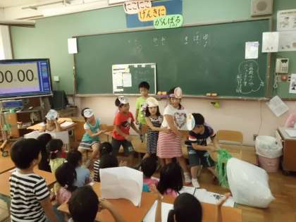 「おおきなかぶ」を役割をきめて,動作をつけて練習しています。