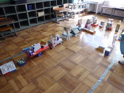 「はこでつくろう」の学習です。箱を積んだり,重ねたり,くっつけたりして作品を作りました。子どもたちの想像力が輝いていました。