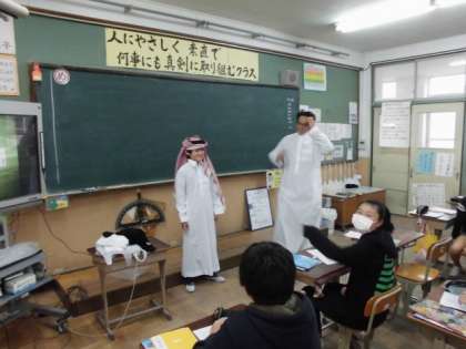 5時間目の社会の時間にゲストティーチャーを招いて,サウジアラビアの学習をしました。これまで学んできたことや初めて知ったことなどたくさん話を聞かせていただきました。子どもたちも楽しんでサウジアラビアの文化に親しむことができました。