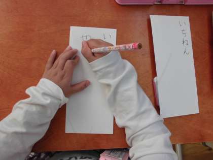 「どうぞよろしく」の会をするために,名前カードを書きました。まだひらがなを全て習っているわけではありませんが,自分の名前を一字一字丁寧に書き,名前カードを仕上げました。カードの裏には,自分の好きなものの絵を描きました。