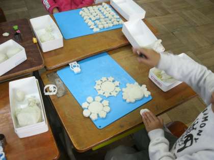 ねんどの二回目は,かた抜きをつかって部品を作って作品を作りました。同じ形を20個以上作ってどんどん積み上げた子や,大きさの違うハート型を重ねてケーキのようにした子など思い思いの作品ができました。