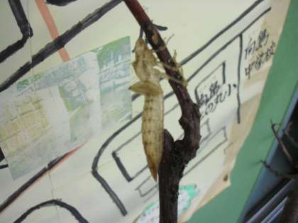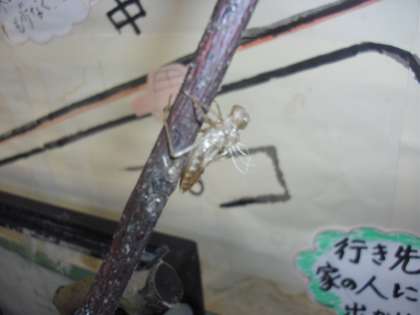 今朝も2匹のヤゴがトンボになっていました。さなぎの殻の大きさがとても違いました。どんなトンボになったのでしょう。朝には,職員室前から姿を消し,広い世界に飛び立ったようでした。
