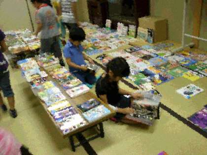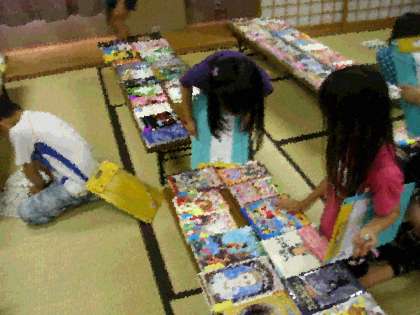 本屋さんに協力していただき,ふるさと館に本を200冊以上並べていただいて,子どもたちが自分で図書館に入れる本を選びました。 大型絵本や挿絵の可愛らしい物,怖い話など,自分の興味に沿って中身や挿絵を熱心に見て自分の一冊を選んでいました。