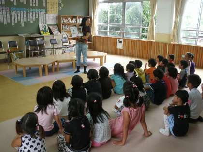 本年度,初めての「ポコポコの会」のお母さんによる読み聞かせがありました。英語絵本「The Gruffalo」を読んでいただきました。英語と日本語訳を交互に織り交ぜての熱演で,子どもたちも熱心に聴いていました。