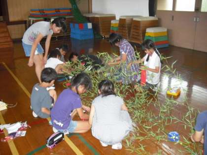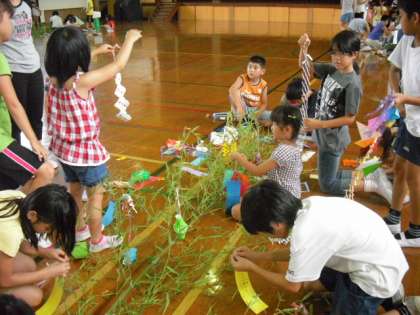 各グループの教室で,笹飾りを作ったり,短冊に夢や願いを書きました。みんなが目を輝かせて書いているのが印象的でした。その後,体育館で,校庭から切り出した笹にみんなで飾り付けました。
