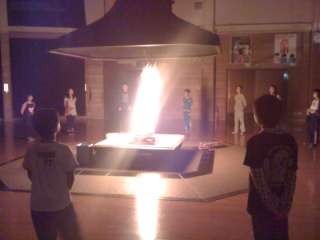気温と他校との関係で一日目にプレイホールでキャンプファイヤーを行いました。室内でも外と同じように薪を焚くことができます。