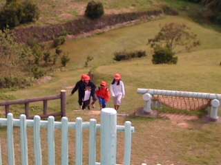 浦山ラリーを行っています。白く見える建物は,山の砦です。