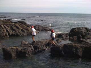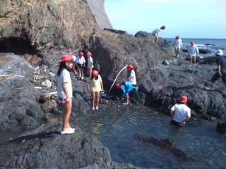 麦崎に到着し磯観察を行っています。この後,志摩マリンランドの方に磯の生物の指導をしていただきます。