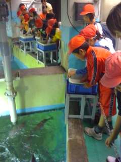 マリンランドでは水族館の見学だけでなく,ペンギンタッチをしたり,水槽の上へ入れていただき餌やりをしたりしています。