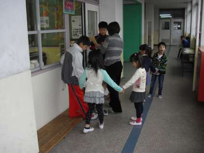来年度の1年生が健康診断に来校しました。5年生が新1年生を誘導するお世話をしました。どの子もやさしく,ていねいに新1年生に対応していました。そのせいか,新1年生は,困ることもなくスムーズに健診を進めたようです。新1年生の皆さんは,また半日入学で二の丸北小学校に来てくださいね。
