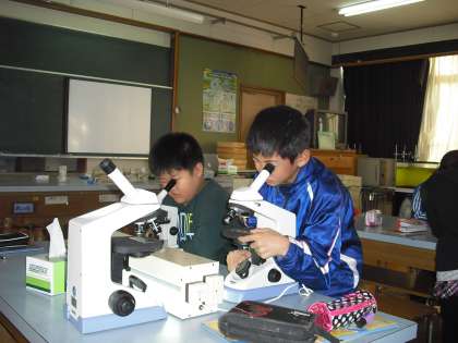 顕微鏡で アオミドロやボルボックス・ミカヅキモ・ミジンコなどを見ました。