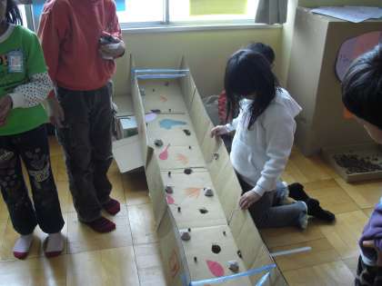 1・2年生が「秋」をテーマに作ったゲームなどを使って,「秋のフェスティバル」を開催してくれました。大きな段ボールなども用いて,なかなか本格的なゲーム作りを行っていました。ドングリを転がしたり,招待された3年生も楽しく過ごしていました。