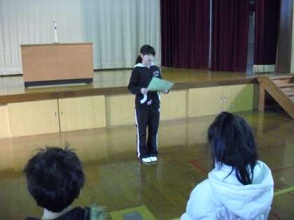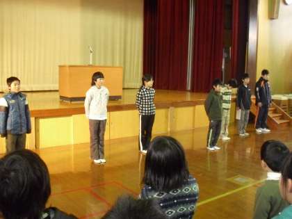 児童会と各委員会から,全校へのお知らせの会を行いました。今月の児童会目標は,「寒い冬,インフルエンザに気をつけ,外で元気に遊びましょう。」でした。保健委員会からもインフルエンザ予防のため,「手洗い・うがい」の励行について話がありました。そろそろ流行を迎えそうです。「手洗い・うがい」「栄養・睡眠」をがんばりましょう。
