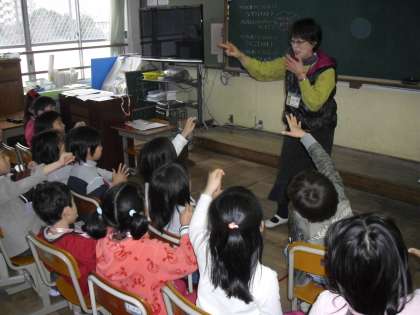 四方先生と英語の学習を行いました。名札を受け取る時は英語でコミュニケーション。移動や指示もすべて英語で1年生でも分かるものです。英語でじゃんけんゲームをしたり,読み聞かせをしていただいたり,英語に楽しく触れさせていただいています。子ども達は特別な意識をせず,自然に英語でコミュニケーションしています。四方先生,ありがとうございます。