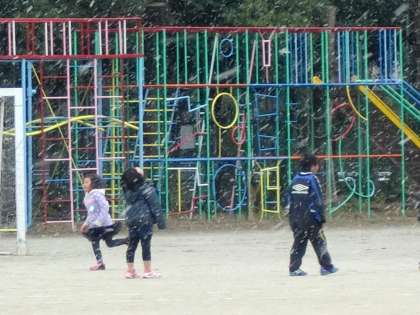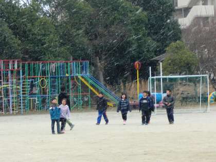 天気予報どおりに,朝からときおり降っていた雪が,昼休み前からしっかり降り出しました。子どもたちは,給食時間が終わるとともに,元気いっぱい運動場に飛び出していきました。5年生がスチューデントシティーのため,居ないにもかかわらず,とてもにぎやかな運動場でした。