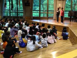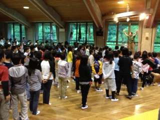 2日目の朝は,同時に宿泊している学校と一緒に朝のつどいを行いました。学校紹介では,しっかりと二の丸北小学校のことを発表することができました。