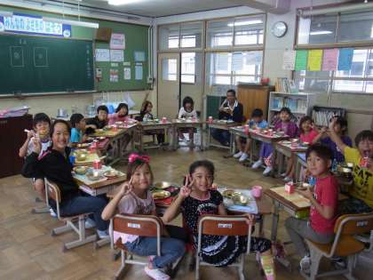 給食時間にALTのデリック先生と一緒に給食を食べました。デリック先生に英語を教えてもらいながら楽しく食べました。
