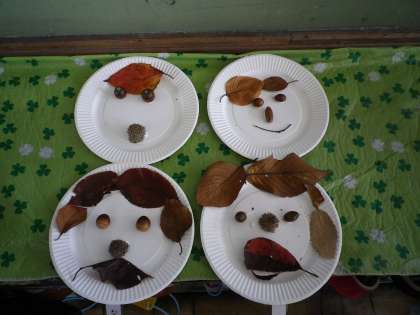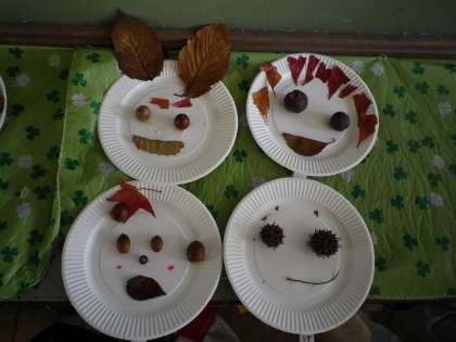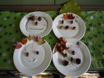 この前,公園で見つけた木の実や葉っぱを使って,顔を作りました。紙皿に,木の実や葉っぱをおいてみたあとに,ボンドを使って付けました。いろいろな表情があって,かわいいですね。