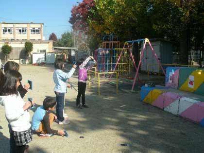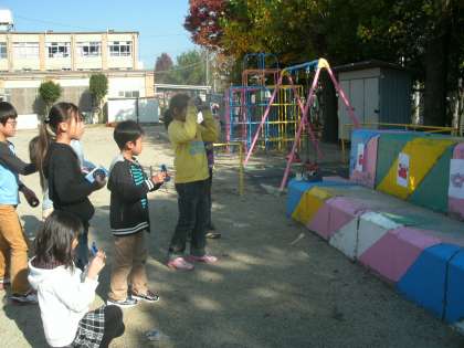 理科の時間に,鏡を使って太陽の光を集めて,光の的あてをしました。鏡に型を当てて,円い光をつくったり,友達と光を集めたり,夢中になって活動していました。