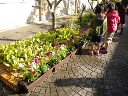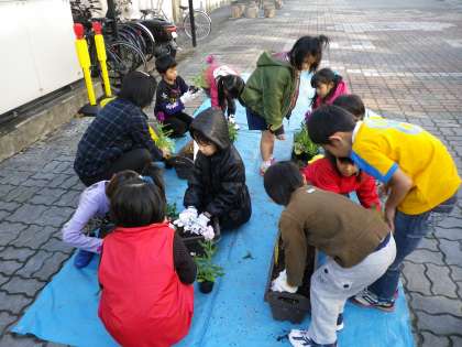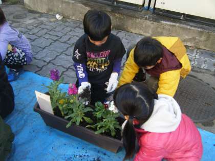 今日の1時間目は,花育活動でした。3人で1つのプランターに,花の苗を植えていきます。ストックとパンジーを,バランス良く上手に植えることができました。春にも1度しているので上手にできました。
