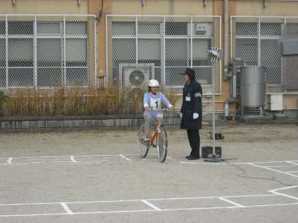 自転車交通教室がありました。5年生は教室で交通ルールに関する筆記試験に取り組んだあと,運動場で実技に取り組みました。ブレーキのかけ方や安全確認の仕方などを警察の方や交通安全ボランティアの方たちが見守る中で実技試験を行いました。