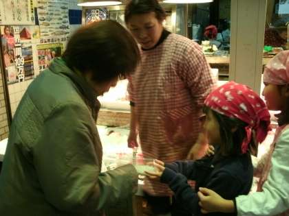 魚屋の魚友さんに仕事体験に行きました。魚をさばいたり,接客したりであっという間の30分でした。魚をさわることにも積極的で,イカのお腹のおそうじにも挑戦しました。張り切っている子ども達に,たくさんの商店街の方が声をかけてくださり,温かく見守ってくださいました。