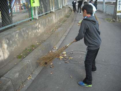 6日(木)の2時間目に落ち葉拾いをしました。学校の周りの道路に落ちた葉やどんぐりを竹箒を使って清掃しました。寒い中でしたが意欲的に清掃活動ができました。