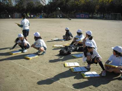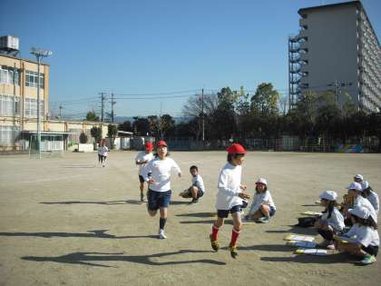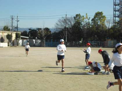 ペアの子どもが「タイム落ちてるよ」「あと2周がんばれ」と