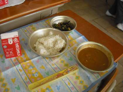 給食の「いろいろな国の食べものを知ろう」シリーズで,12月13日はインド料理カレーでした。給食では,ローリエやオールスパイスの香辛料も入っているそうです。味をまろやかにするために,ヨーグルトやチーズも使ってあります。子ども達は,大好きです。大盛りでたくさん食べてくれる人もいるので,残采はありませんでした。