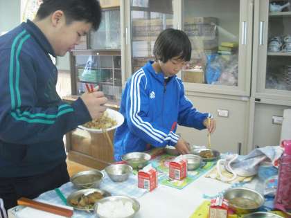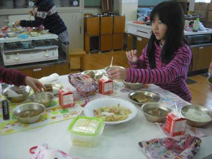 おいしそうに仕上がったジャーマンポテトは,給食と一緒に食べることになっていました。少し早い目ですが,給食の準備にかかりました。配膳が終わるころを見はからってジャーマンポテトを温めなおしました。おかずのブロッコリーの食器にいれたり,ごはんの横に付けたりしていました。給食もジャーマンポテトも完食しました。すばらしい!
