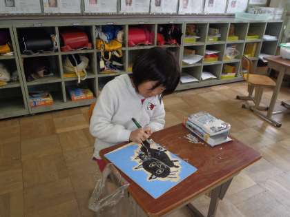 はじめて彫刻刀で版を彫りました。手を彫刻刀よりも前に出さないように,注意しながら彫っています。力がすごくいるのであちこち痛くなるようですが,頑張って彫っています。