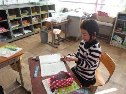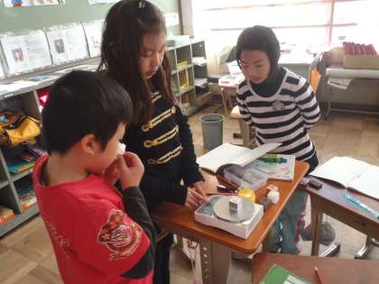 体積は同じでいろいろな材質のものの重さを比べる実験をしました。手にとって重さを感じている時の表情がとっても一生懸命でした。