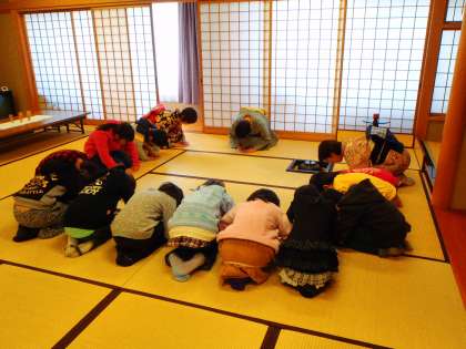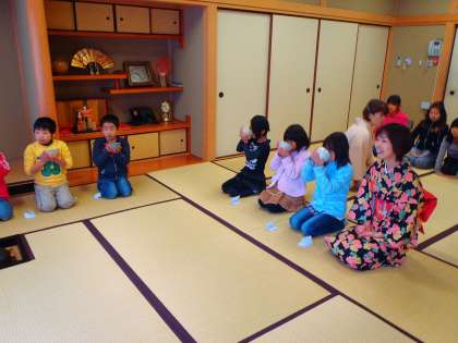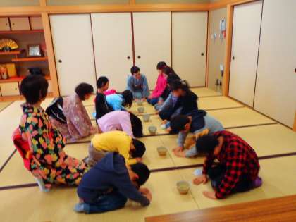 茶道教室がありました。座り方・姿勢・おじぎの仕方やタイミングなど,丁寧に教えていただきました。抹茶が苦くて苦手な子どもも,「しゃべってはいけません。」という先生のお言葉を守って,苦さにも姿勢をくずす事無く頑張って飲みました。