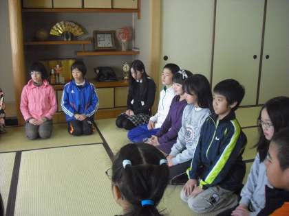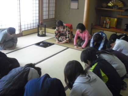 たたみの目を16数え座る位置を決め,いよいよ小学校最後の茶道教室がはじまりました。まずは,背筋をぴんとのばし少しそり気味に正座します。腰から体を折る美しいお礼の仕方を教わり,みんなでご挨拶しました。なかなかステキです。