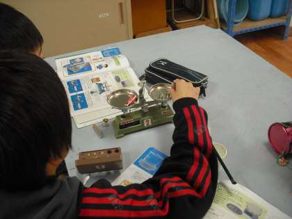 理科で「ものの溶け方」の学習をしています。今日は電子てんびんと上皿てんびんの使い方を学習しました。試料を少しずつ慎重にのせていました。