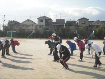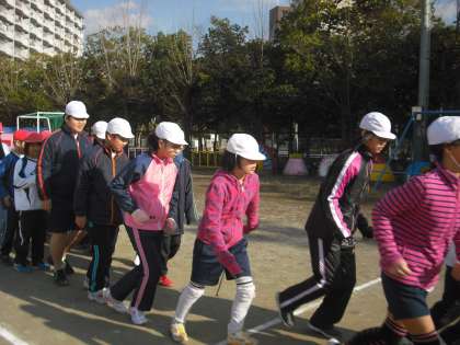 さあ,いよいよ最後の持久走大会です。5.6年の係りが前に出て準備体操!その後少し体を温めるためにランニングをしました。少しずつ緊張が高まっていきます。目標のタイムが出せるでしょうか。