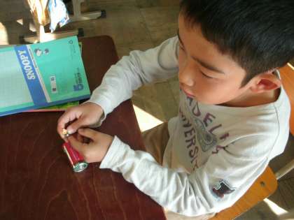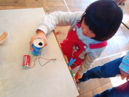 豆電球であかりのつく仕組みについて実験しています。