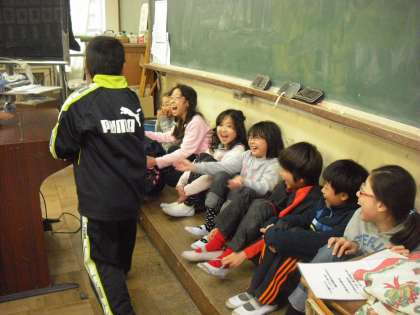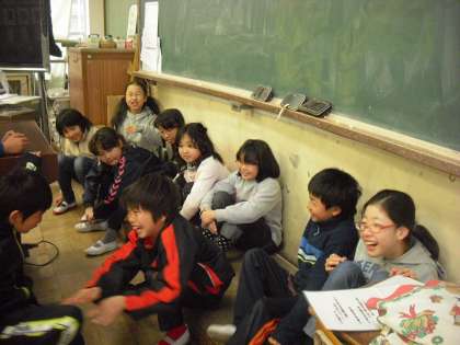 黒板前の 教壇に座って 何やら 始まりました。