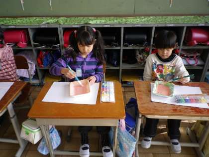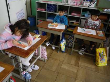 図工では,初めて絵の具セットを使いました。今日は,3つの色をまぜて,はだの色を作りぬりました。来週には,もう一人の「自分」が完成しそうです。