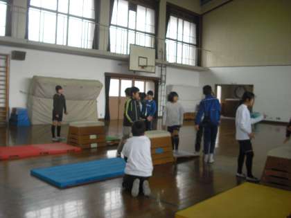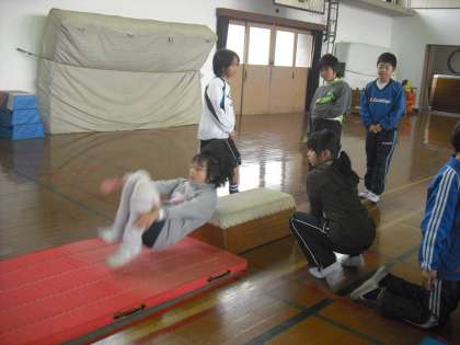 台上前転をしました。今日は1段から始めて,5段まで挑戦しました。5段ぐらいになったほうが前転の後,立ち上がりやすいのでうまくできる人と,ロイター板をおいて跳んだほうがよい人とがいましたが,みんな3段までは回れていました。