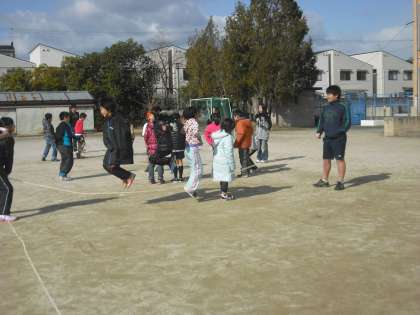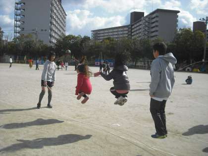 今日はお天気もよく,昨日確認した各グループの場所に最初から集合でき,さっそく跳び始めました。約10分間の練習ですが,昨日より確実に上達していました。4回が最高だったグループがなんと,14回も連続で跳べました。