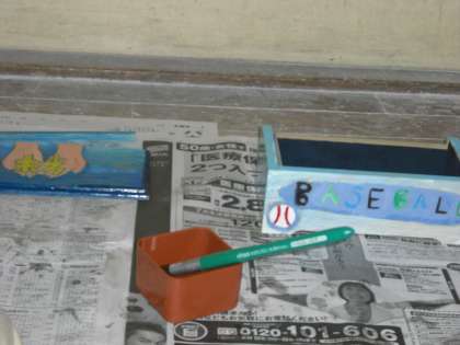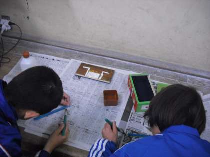 丁寧に仕上がってきました。今日はニスを塗り,中の厚紙を貼りピンをさして何人かの人が組み立てていきました。ニスを塗ると,ピカピカにはなりませんが落ち着いた色合いに仕上がっていきました。