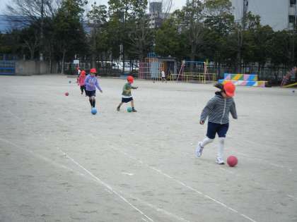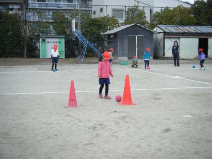 体育の時間に,ボールをける練習をしました。足の内側を使うと,うまくいくことに気づけていましたね。根気良く練習を続けていました。