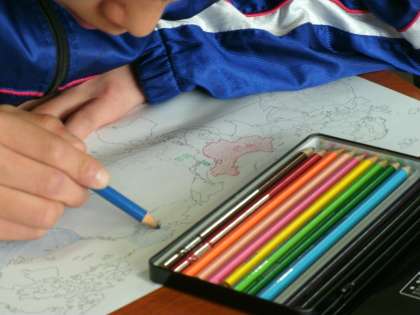 今社会科では,世界の中の日本について勉強しています。みんなが調べ学習をしたのは,アメリカ,中国,韓国,サウジアラビアの4つの国です。アメリカや中国は日本の25倍も国土があり人種や民族も多様です。今日は,世界白地図で場所を確かめました。