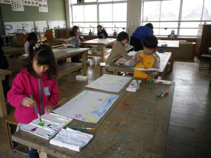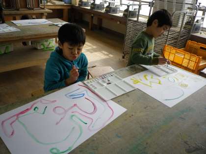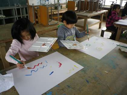 絵の具セットを使って,いろいろな線を描きました。パレットや水入れの使い方も学習しました。色作り方も,上手にできましたね。